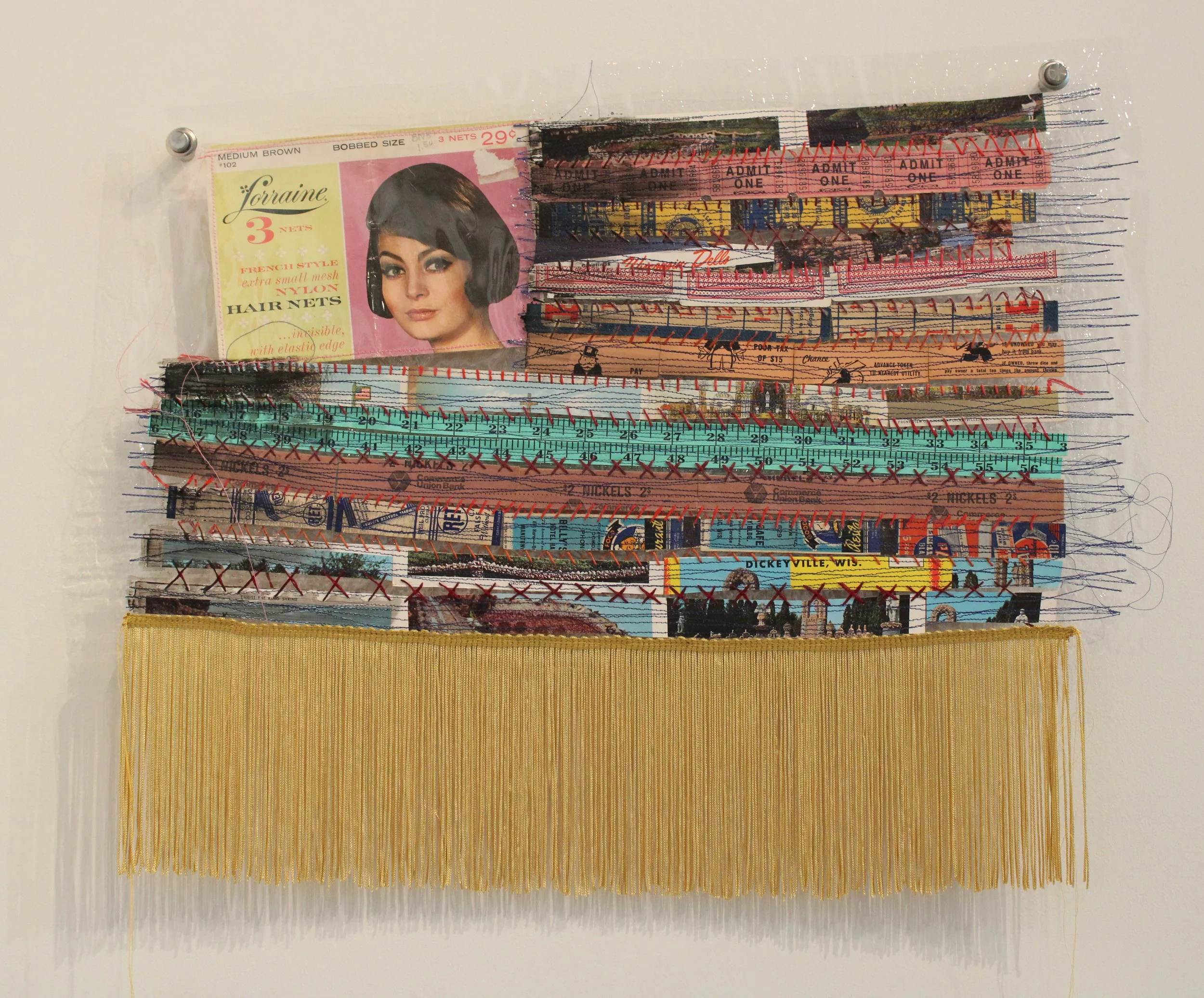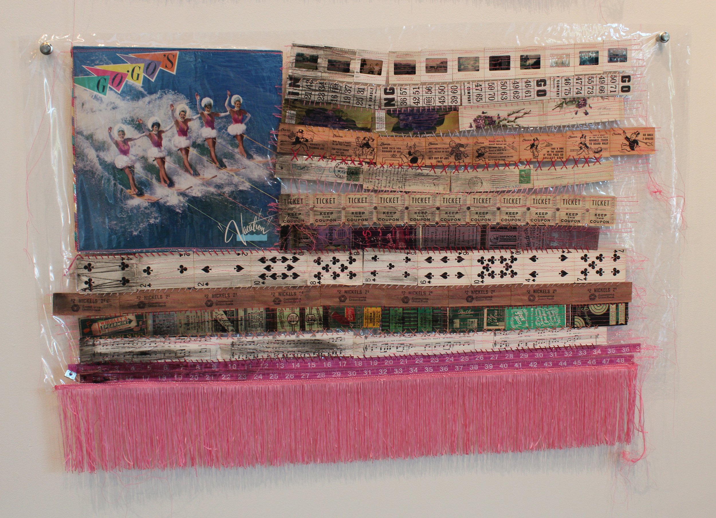 I have used the American flag and all its preexisting meanings as a vehicle for exploration of the feminine. I select materials and machine sew them onto vinyl. Yes, the fabric store, by the yard, cover your 1950's couch to protect it from the guests, vinyl. I then hand sew the stripes. Some of the works are covered in 3 layers of quality resin for a high gloss finish. I use unexpected materials to create these pieces such as vintage slides, matchbook covers, old photos, tickets, playing cards, etc. There are cleared checks in some of the pieces that were house payments made by my In-Laws on their American dream. The measuring tape and the repeated use of numbers represents how women are constantly being measured in a unique way from men.